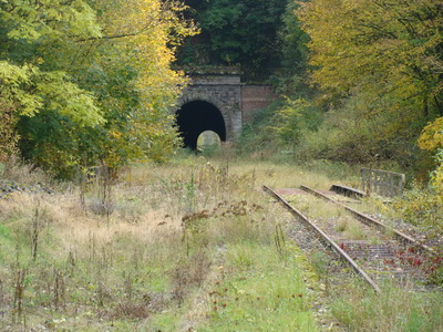 Das Nordportal des großen Ittertunnels aus Blickrichtung des ehem. Bahnhofs „Itter“. Vor dem Tunnel die Brücke über die Itter.