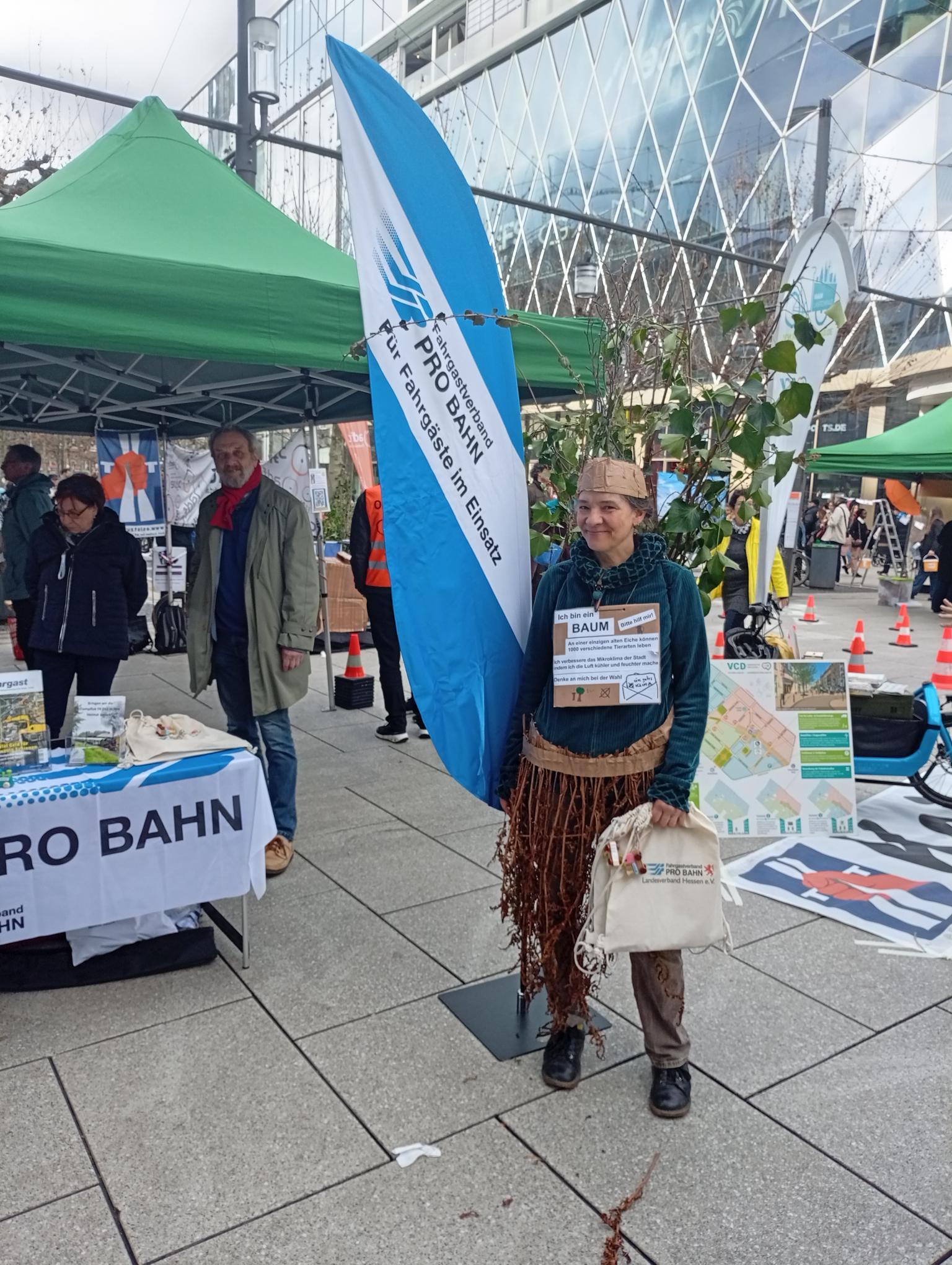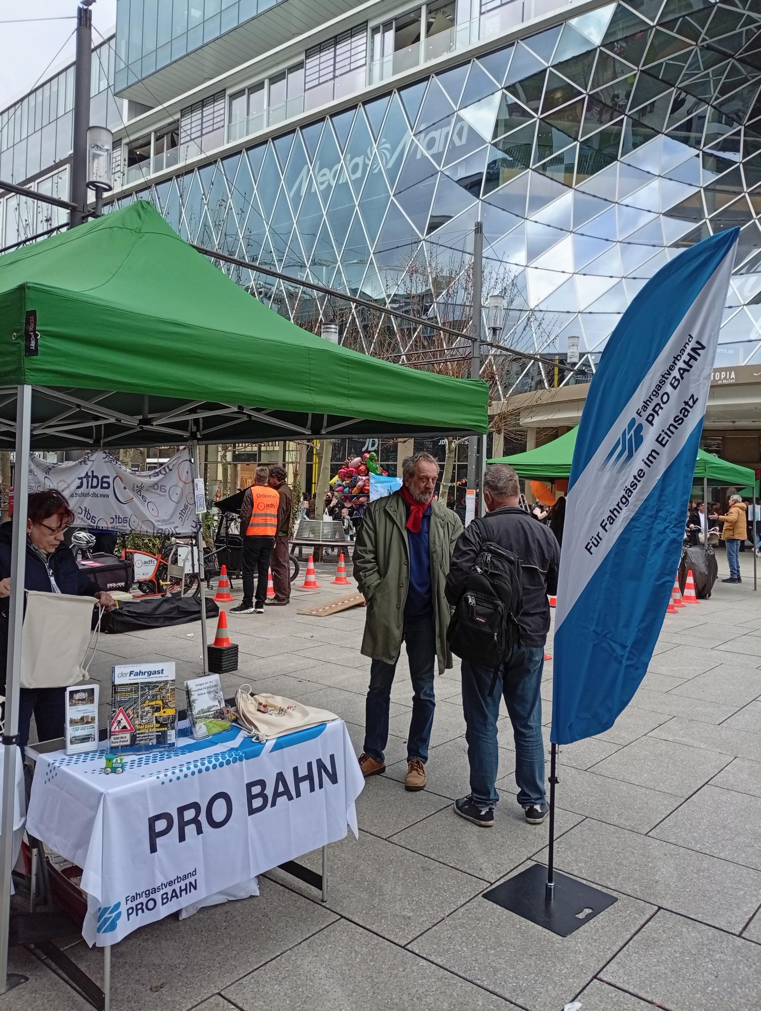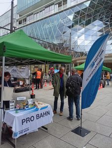 Am 28.02.2026 fand der „Aktionstag für ein gutes Klima“ in der bekannten Fußgängerzone „Zeil“ in Frankfurt am Main statt. Von 12:00 Uhr bis 16:30 Uhr konnten sich die Passantinnen und Passanten an vier Informationspavillons eingehend informieren, wie sich diese für einen Stopp des Klimawandels, eine bessere Umwelt und für eine Verkehrswende einsetzen. Einer der Pavillons war dem Thema „Verkehr“ gewidmet und in diesem fand unter anderem der PRO BAHN Landesverband Hessen mit dem PRO BAHN Regionalverband Frankfurt/Rhein-Main einen Platz für die Information und das Fachgespräch. Mehrere Giveaways hatten PRO BAHN Hessen und PRO BAHN Frankfurt dabei aber auch Informationsflyer und Ausgaben der Verbandszeitung „Der Fahrgast“. Die Zeit auf der Zeil, einer der umsatzstärksten Einkaufsmeilen Deutschlands, sie verging wie im Fluge. Auch wenn es eine logistische Herausforderung war, das verschiedenste Material mitten in die Fußgängerzone zu bringen. Die mitwirkenden PRO BAHN-Funktionärinnen und -funktionäre waren sehr erfreut über den Verlauf.