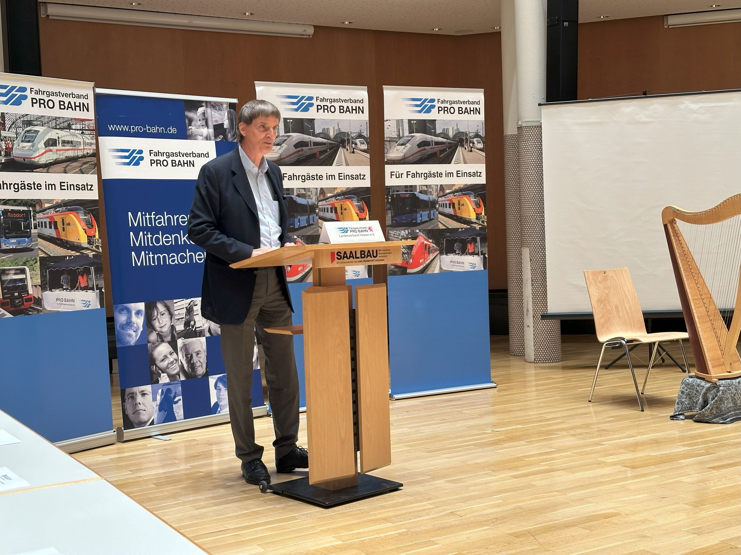 Am Wochenende fand die Verleihung des Hessischen Fahrgastpreises 2024/2025 im Saalbau Gutleut in Frankfurt am Main statt. Der Landesvorsitzende des PRO BAHN Landesverbandes Hessen, Thomas Kraft und die Regionalvorsitzende des PRO BAHN Regionalverbandes Großraum Frankfurt Dr. Barbara Grassel, sie konnten Vertreterinnen und Vertreter aus Bundes- und Landespolitik, des öffentl. Verkehrswesens und deutschlandweiter Fahrgastbeiräte willkommen heißen, ebenso PRO BAHN-Mitglieder aus Hessen und anderen Bundesländern. Künstlerisch umrahmt wurde die Veranstaltung durch Live-Musik mit mehreren sanften Stücken auf einer Harfe.